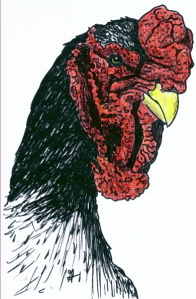 Long, thick, almost erect. The throat is full, feathers are thin, showing red skin. Neck hackle is thin, short, covering slightly the base of the nack..